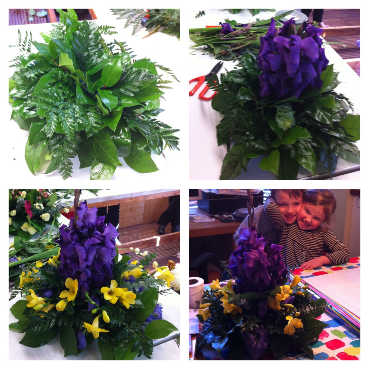 Mine was delivered to my friend H and a pic of her two little people with the finished arrangement… Hmmm although to be honest I’m not sure how long it will last as they were both fighting over smelling the freesias as I left!!