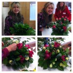 We had a giggle. We learnt how to do a flower arrangement. We learnt lots of tips and tricks. Soak the oasis in water with flower food and a drop of bleach so it is fully absorbed before you start arranging. Tie it to the base. Start with the green foliage. Use lots of green stuff. Add ferns and eucalyptus leaves to make it more interesting. Spray with leaf shine! Then add your focal flowers. Use odd numbers. Try to only have 3 colours in total (inc green). Infill until you can no longer see any oasis.