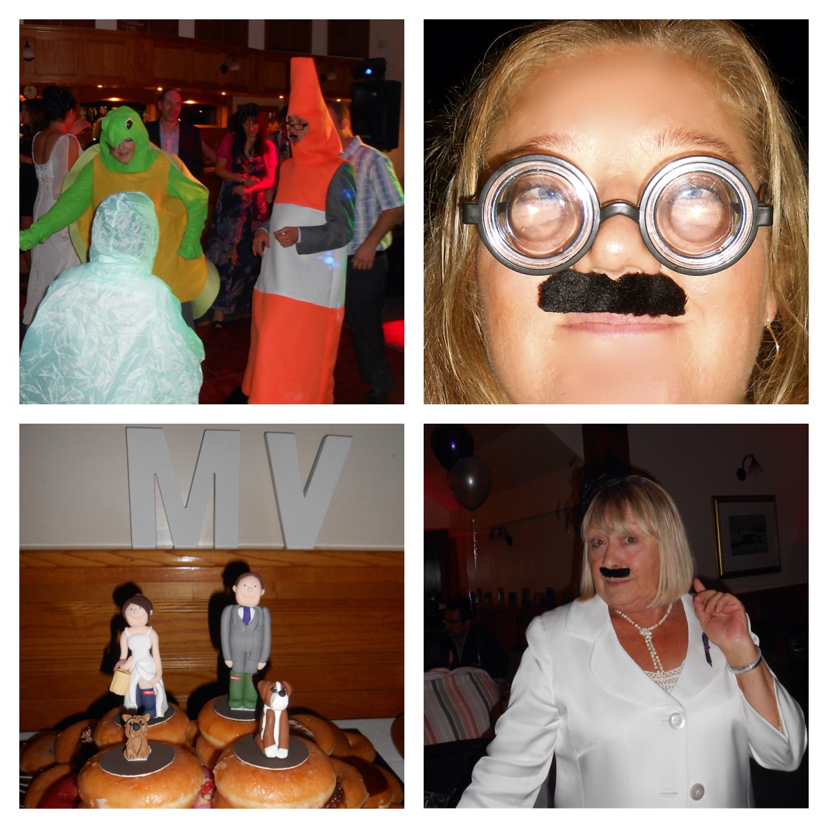 At the evening reception I had to chuckle when I arrived to find that some guests were already sporting tashes! The bride had said to me last year that she’d love tashes at her wedding… my bag was packed! The bride and groom had dressed each table with a selection of romantic, thoughtful items together with some fun sparklers, glasses, tashes etc. The evening was wonderful. The music choices fabulous… it’s rare I go to a wedding where there are more guests on the dancefloor than off it! We were even joined by a traffic cone and a turtle.