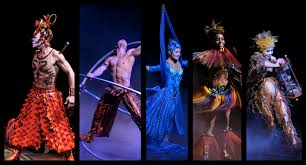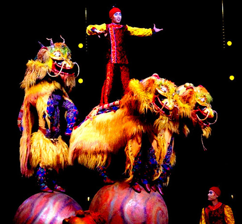 The story of Dralion draws the inspiration from Eastern philosophy and harmony between humans and nature. There are four elements that govern the natural order and these are represented by colour in the performance; air is blue, water is green, fire is red and earth is ochre.