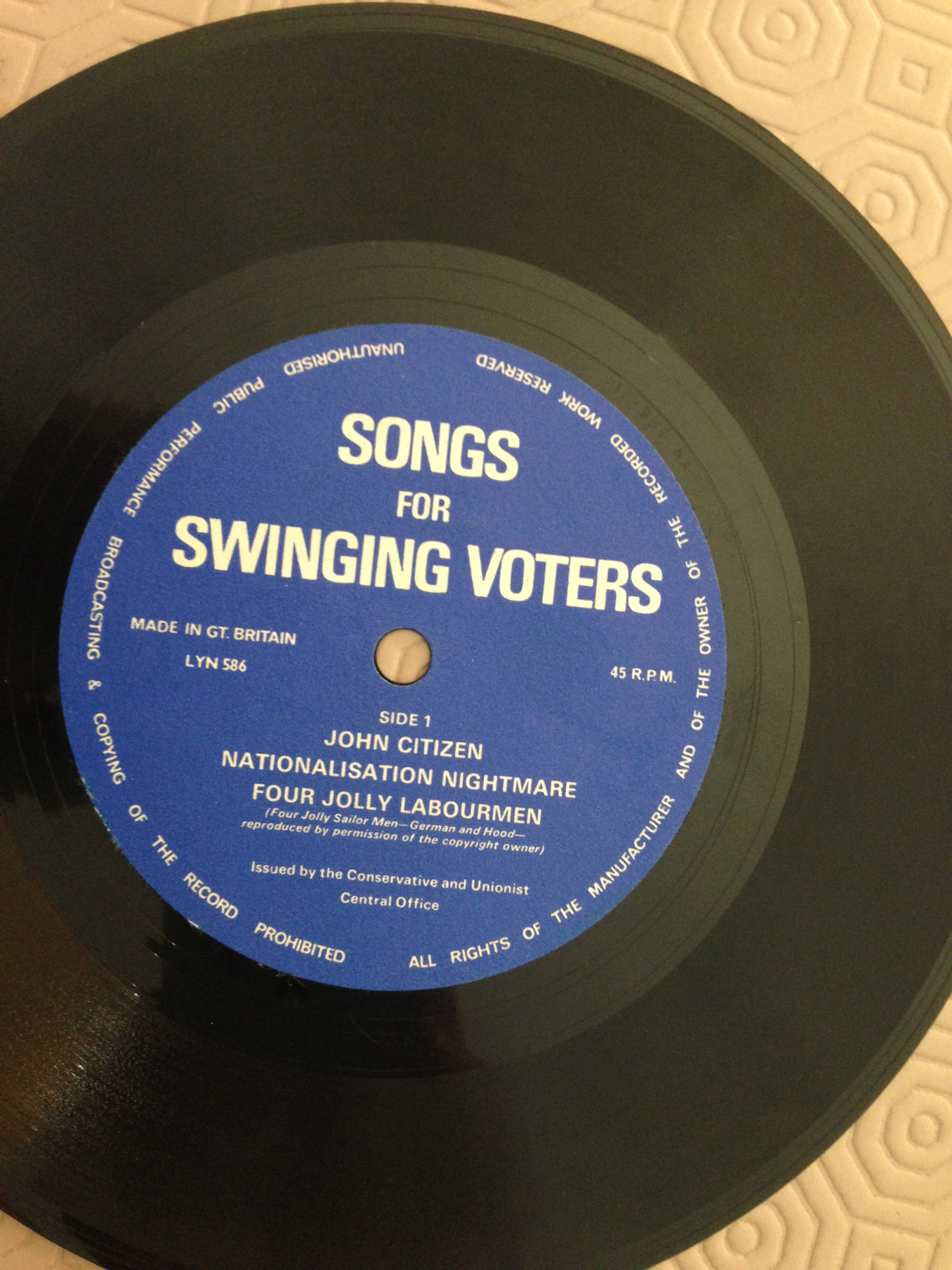 “Songs for Swinging Voters” [features on Side 1: John Citizen; Nationalisation Nightmare; and Four Jolly Labourmen. Side 2: One Man Band; Poor Old Jo; and John Citizen] a six-track flexidisc of anti-Labour singalongs issued by Conservative Central Office