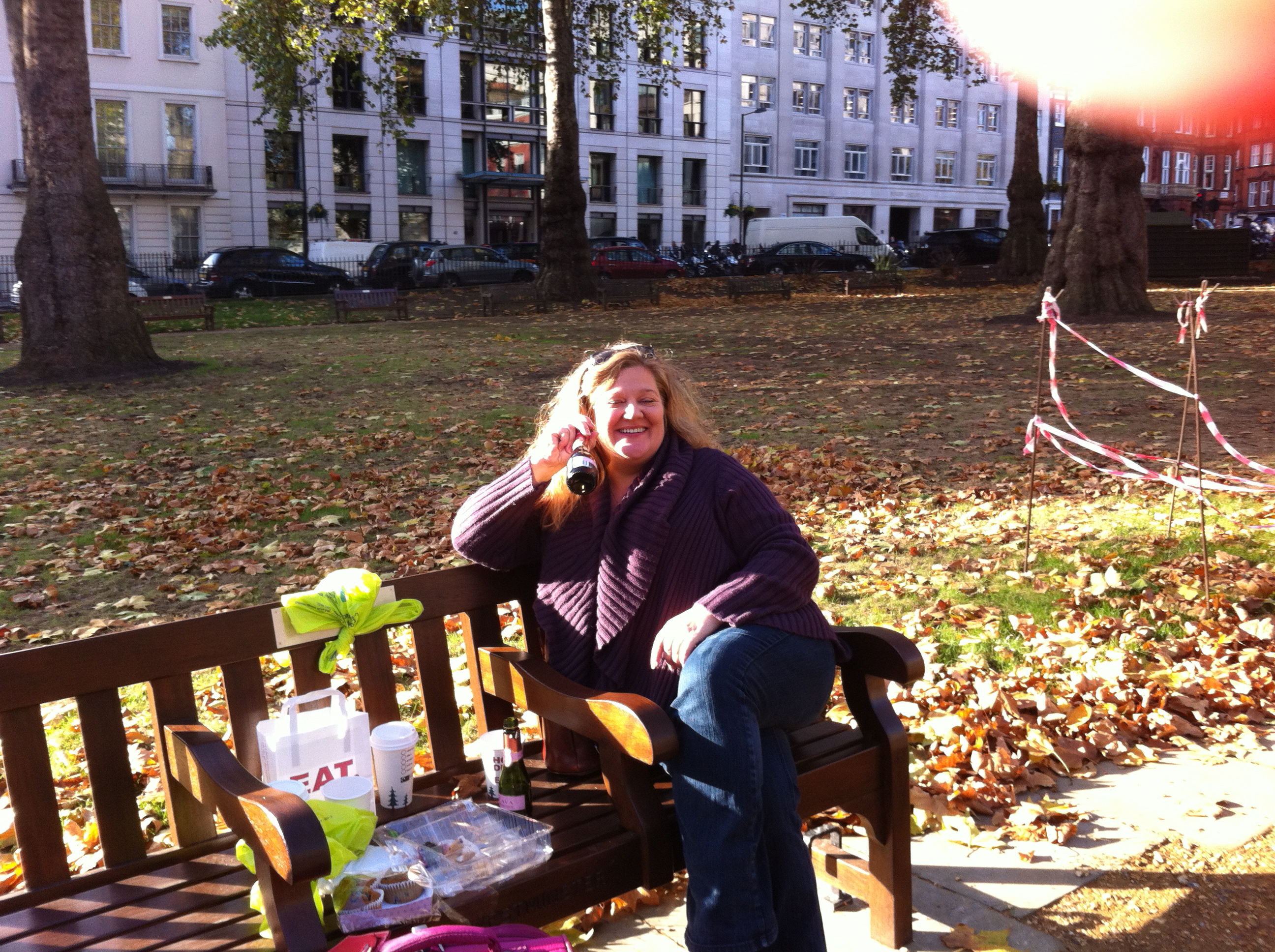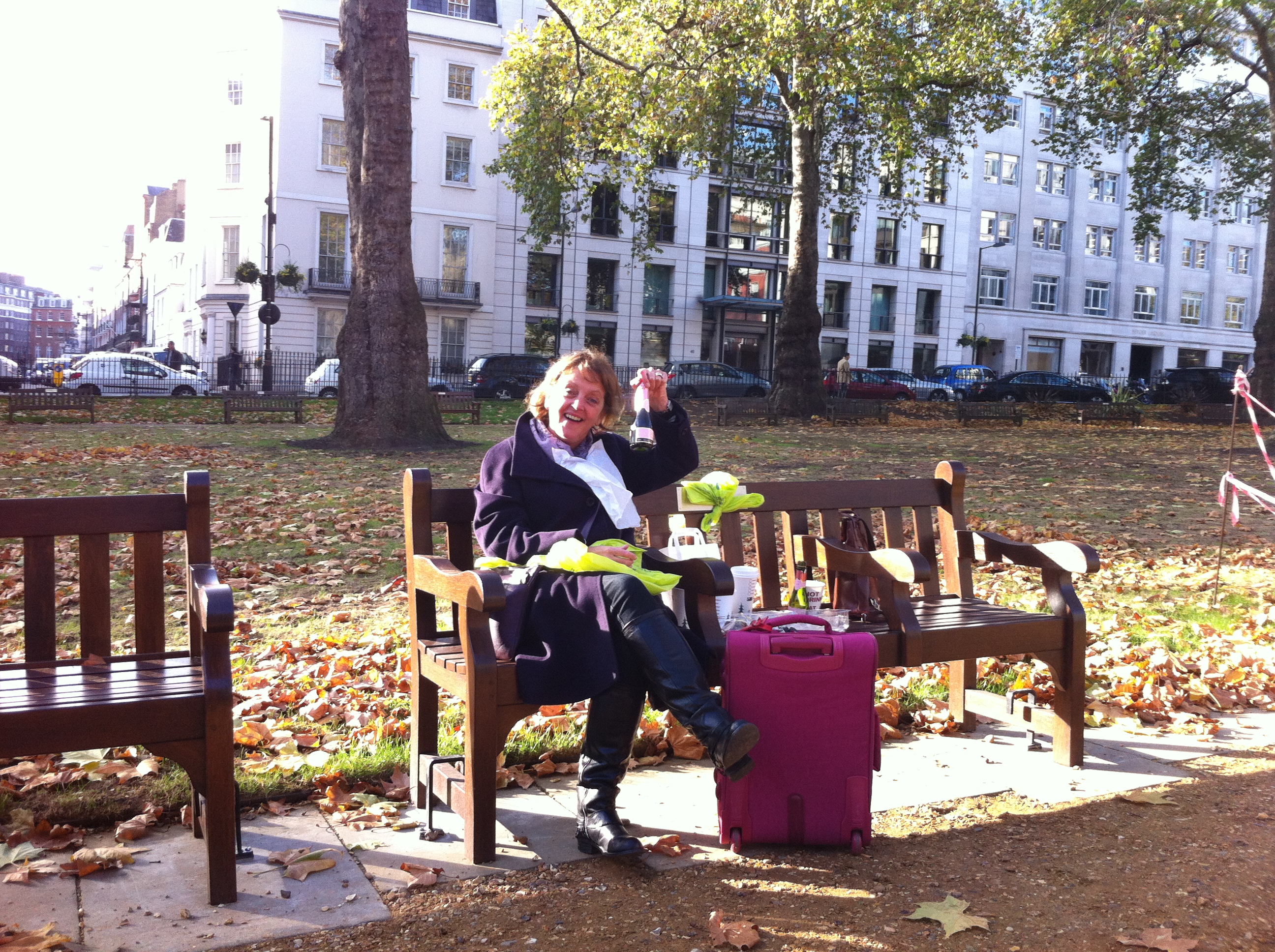 This morning, Elizabeth suggested that we celebrate my birthday with a breakfast picnic and bubbles at my bench in Berkeley Square.