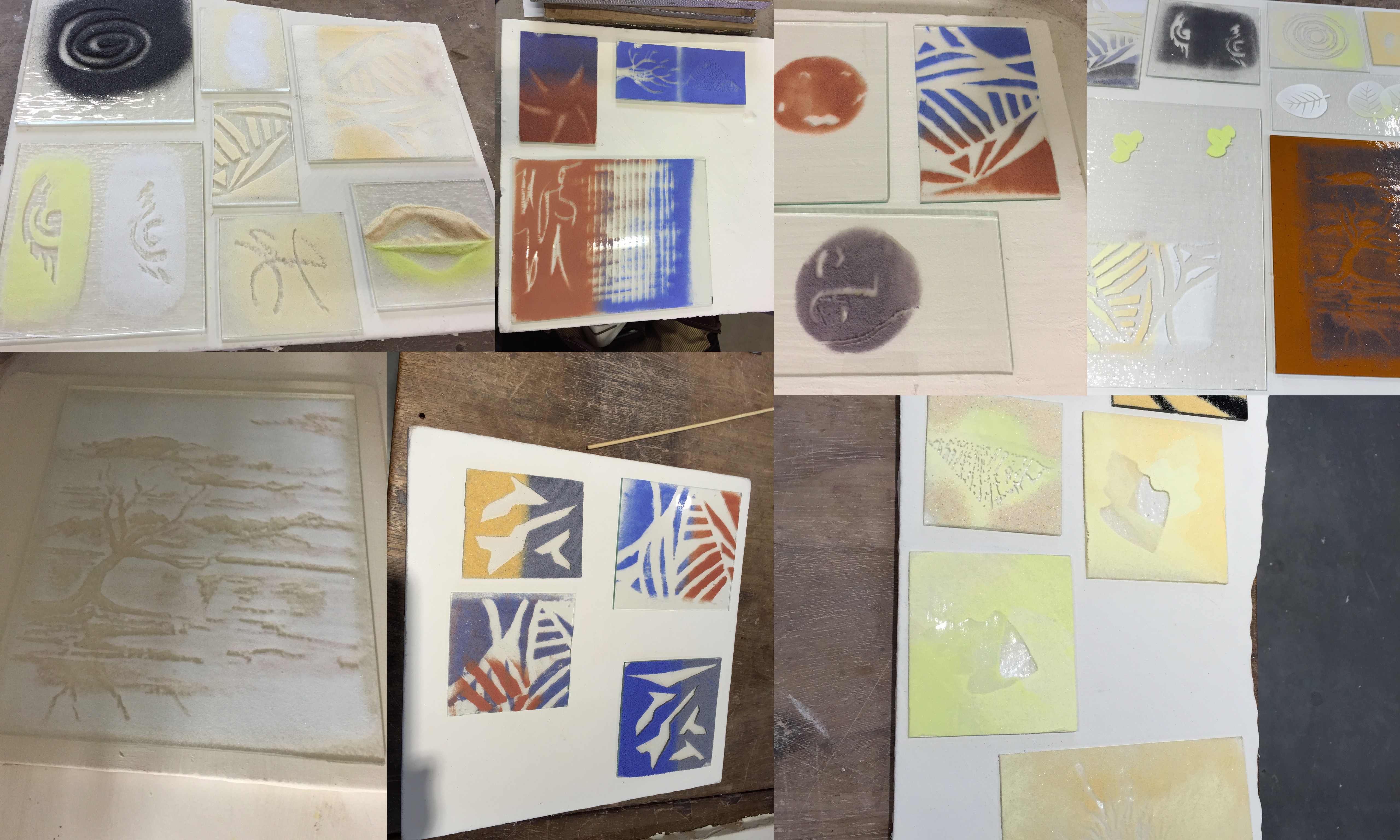 As you can see the screenprinted images using black ink have worked well. Sadly the blue ink is fairly pale on most and the orange ink has in most places burnt away. Personally I love the unpredictability of some areas in glass and it’s why there’s a need to test everything as you go along and continually learn.