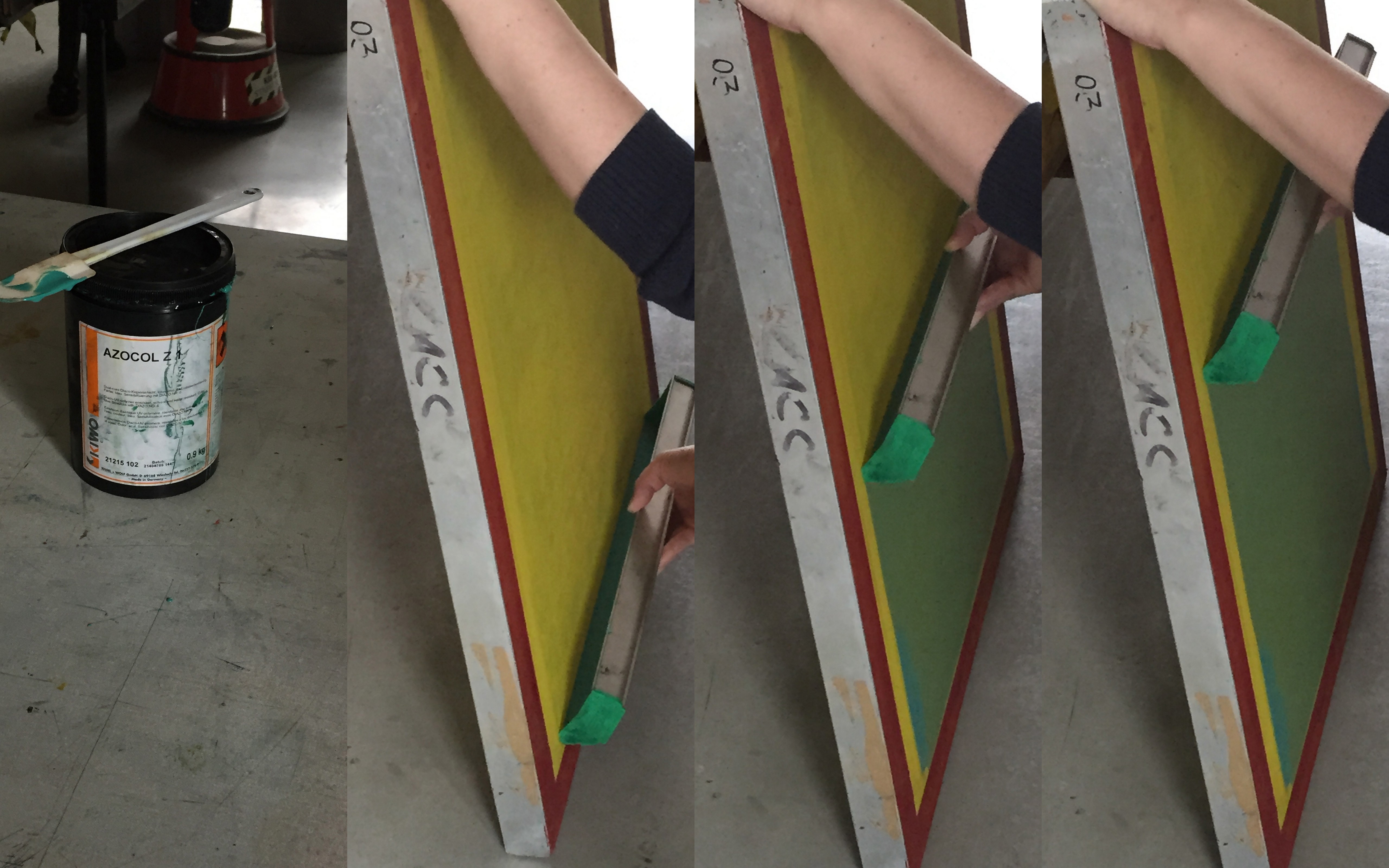 First the area is ‘flooded’ with ink by carefully dragging the ink over the area. Then the glass is placed under the screen (in the cardboard slot) and ink is pulled over. As my images have incredibly thin lines I dragged the ink over it several times, hoping that it would be a clean thicker line without being smudged.