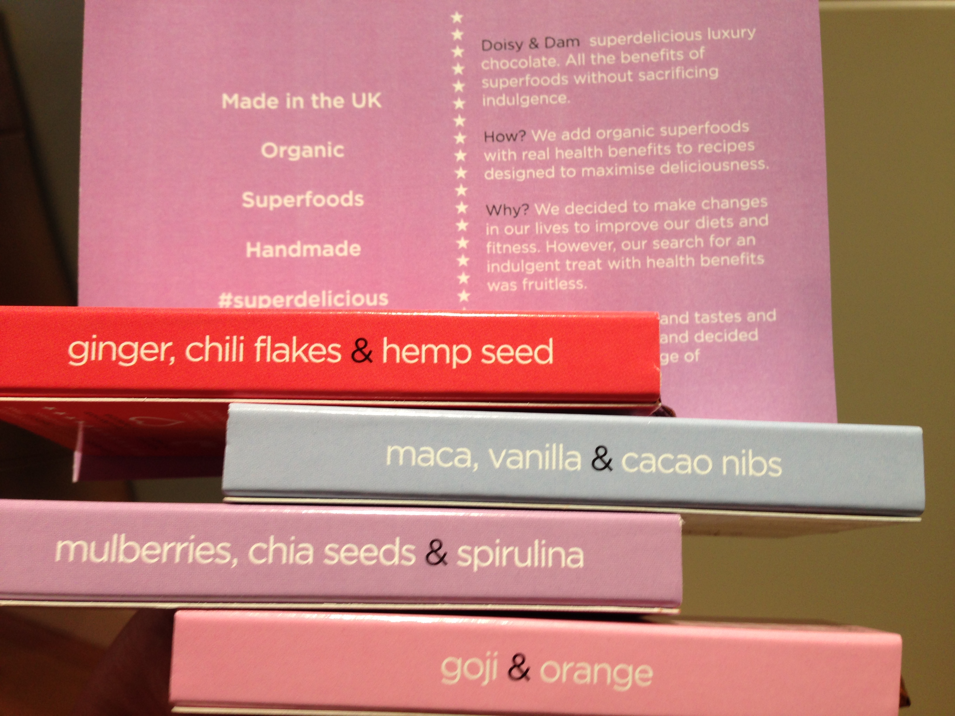 Verity and Louise had to then leave us and head off to the theatre.  Leaving Nova and I to explore the rest of the festival.  It’d be fair to say that we sampled something from most stands and managed to resist buying too much to take home… well except the most delicious chocolate from Doisy & Dam.  If you look at the ingredients, it’s really quite healthy and damn it’s tasty!
