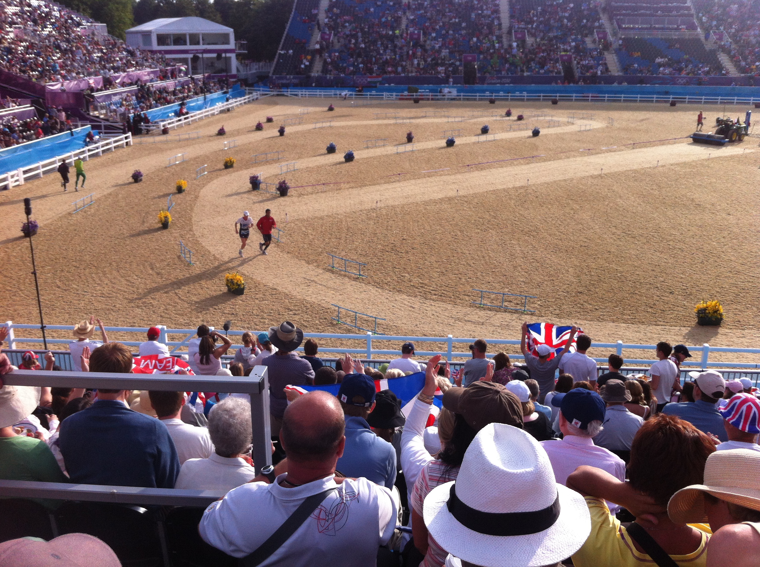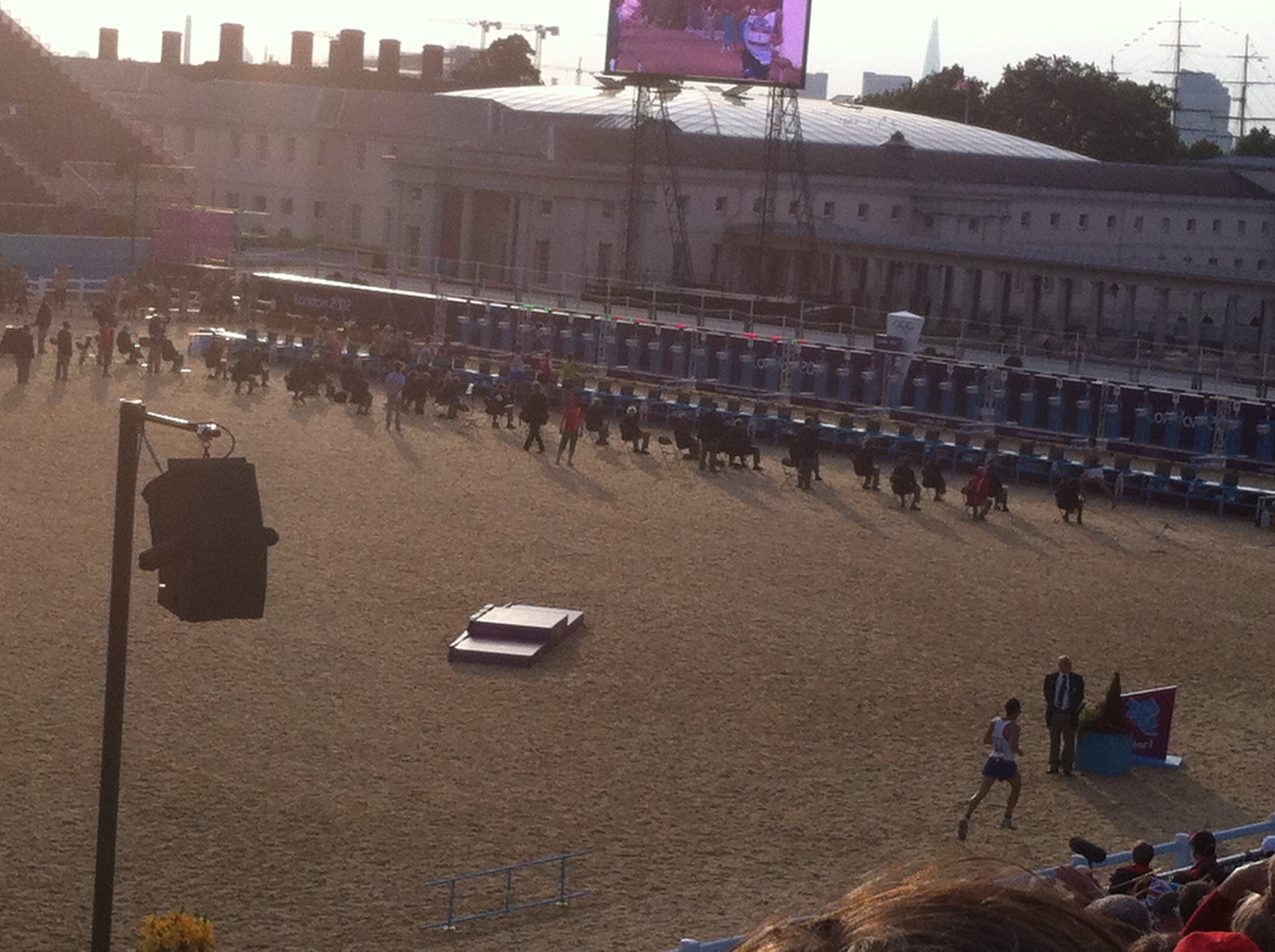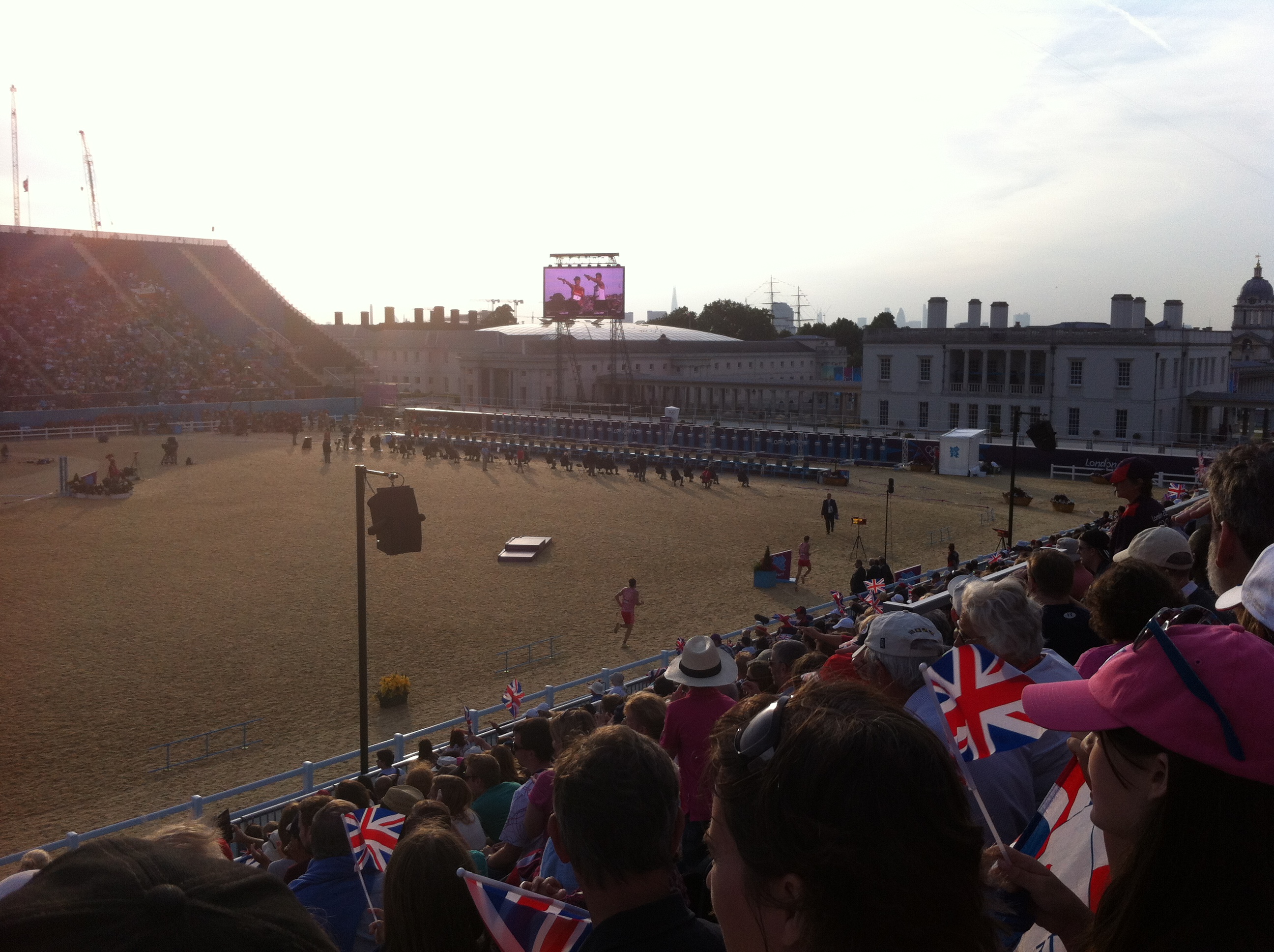 We saw some amazing control and also some very wilful horses, not least when one threw their rider off and then fell on his legs – truly thought that would be the end of the rider for this competition but after the horse was caught by the gamesmaker volunteers, the remounted it and reminded it who was boss as he completed the course. He didn’t have a great round but he did get round and went on to complete the run/shoot too but I wonder how bruised he is now!